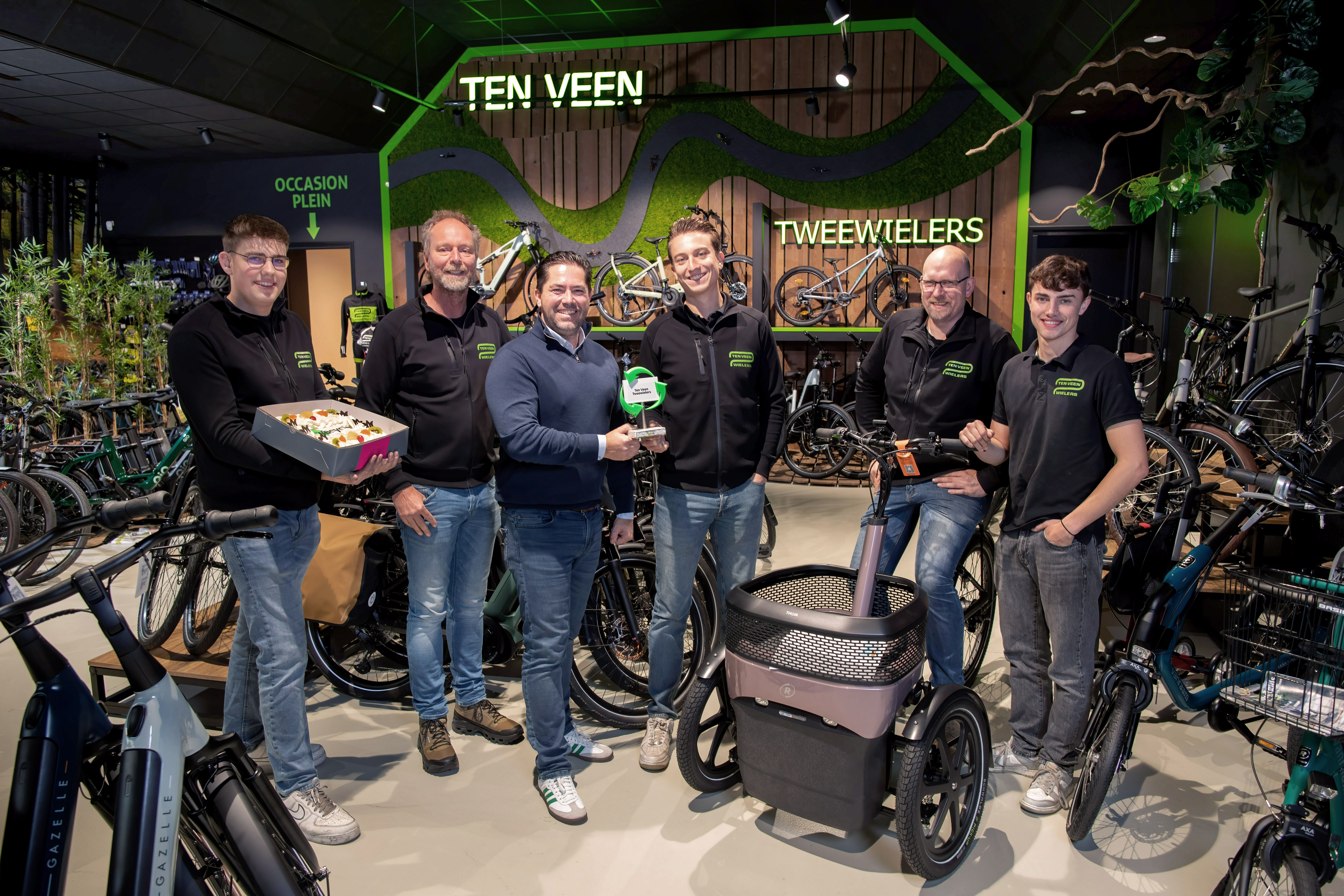 De elektrische fiets is niet meer weg te denken uit het straatbeeld. “Op dit moment is ongeveer 80 procent van de fietsen die ik verkoop elektrisch”, vertelt Dylan ten Veen, mede-eigenaar van Ten Veen Tweewielers. Het familiebedrijf met drie fietsenzaken in Oldemarkt, Steenwijk en Wolvega – dat werd opgericht in 1936 en nu naar de vierde generatie wordt overgedragen – ontvangt een Wecycle Award voor het inzamelen van fietsaccu’s in het filiaal in Oldemarkt.