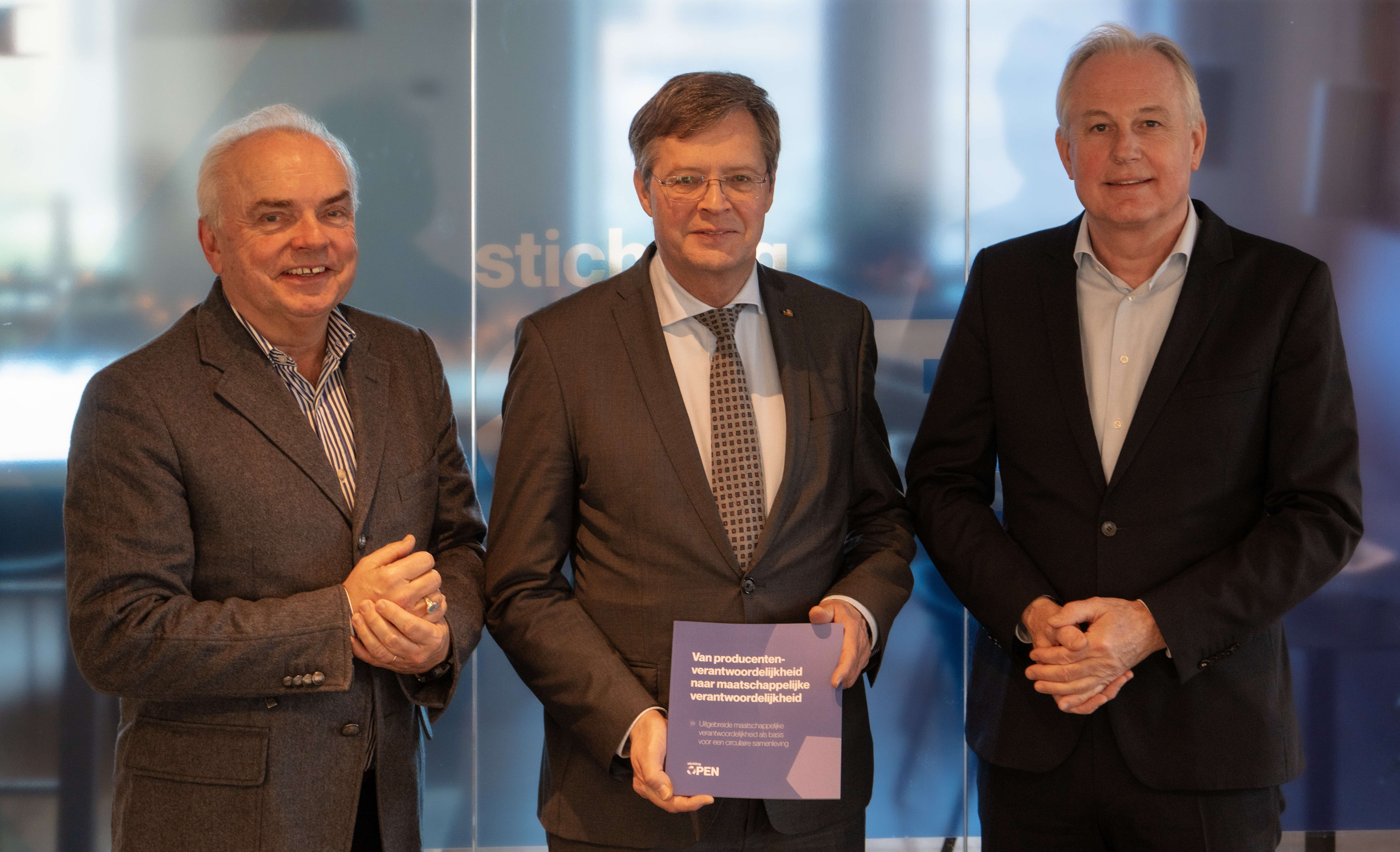 In het visieboek ‘Van producentenverantwoordelijkheid naar maatschappelijke verantwoordelijkheid’ schetst Stichting OPEN de noodzaak van de transitie naar een circulaire economie en welke stappen hiervoor nodig zijn. Jan Peter Balkenende (voorzitter van de Raad van Advies van Stichting OPEN) nam op 10 december een exemplaar in ontvangst uit handen van Steven van Eijck (bestuursvoorzitter Stichting OPEN) en Jan Vlak (directeur Stichting OPEN).